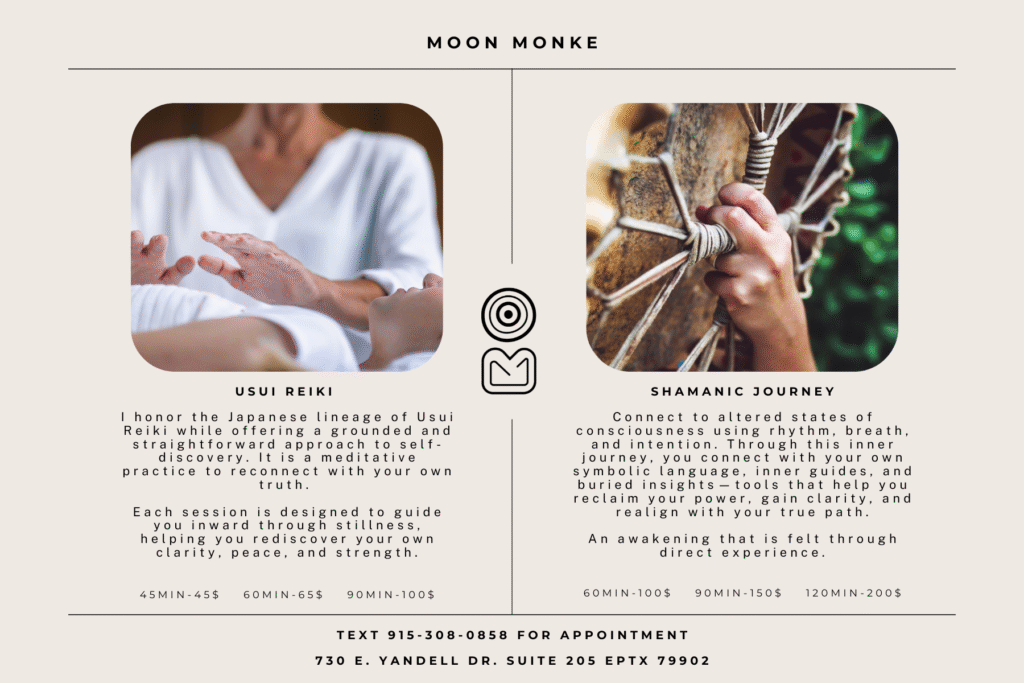 Hi. Hola. Usui Reiki. Shamanic Journey. Book a Free Discovery Call!Text 915-308-0858 for Info.Sessions Available In-Office, Remote, In-Home, or Outdoors. Instagram